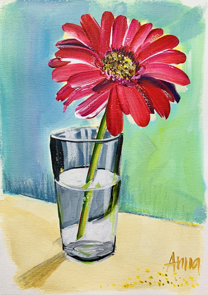 Join me to learn how to paint a flower in a glass - bouncy petals, a stem viewed through water, reflections and shadows - you'll be learning while you're actually painting!